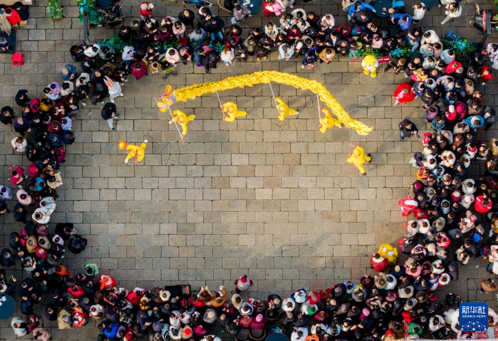 2月17日,人们在江苏省泰州市海陵区老街景区观看舞龙表演(无人机照片)。