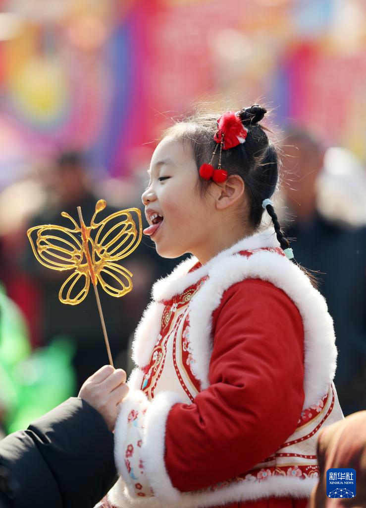 2月17日,在山东省临沂市郯城县郯国古城景区,一名小女孩在品尝糖画。