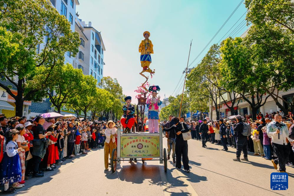 2月17日,游客在云南省玉溪市通海县观看传统民俗通海高台展演。
