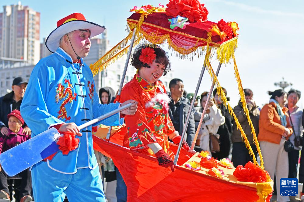 2月17日,在山东烟台黄渤海新区万达广场,民间艺人表演海阳大秧歌。