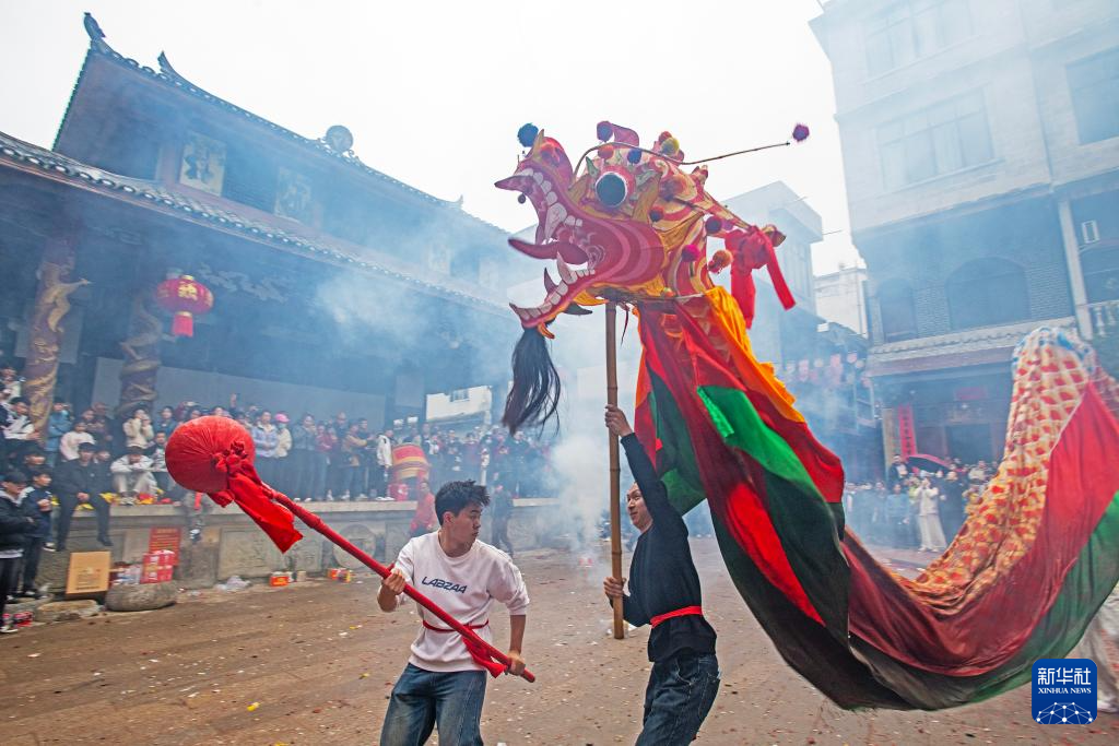 2月17日,民俗舞龙队在广西壮族自治区靖西市新靖镇旧州街舞龙拜年。