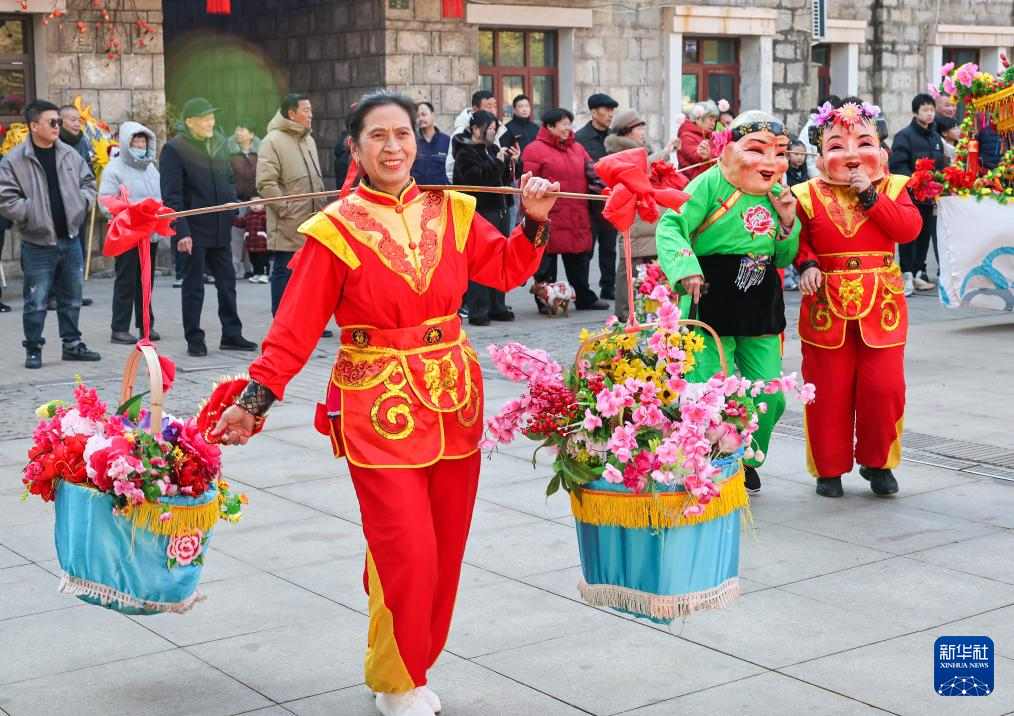 2月17日,民间艺人在江苏连云港市连云老街表演挑花篮。