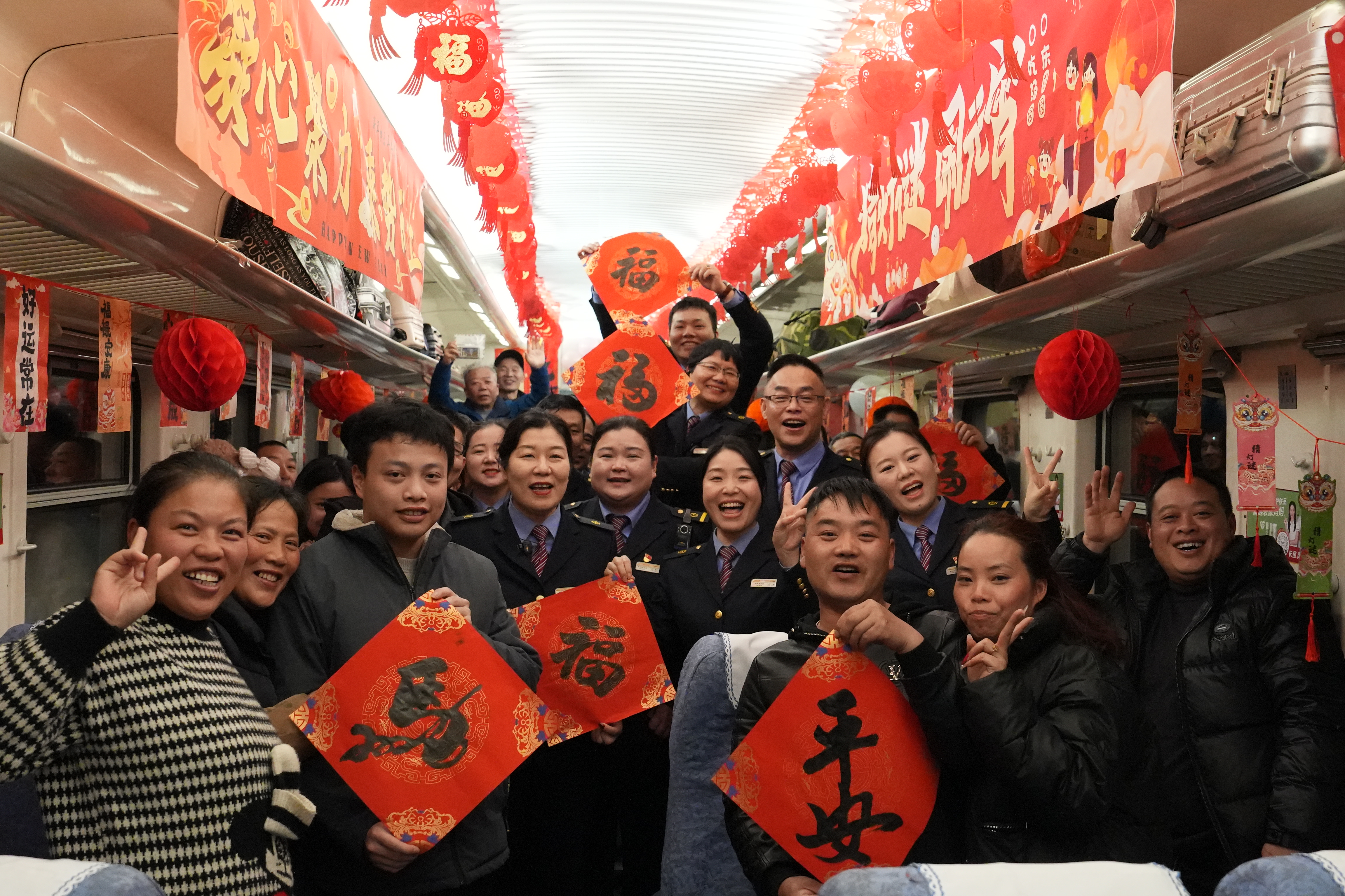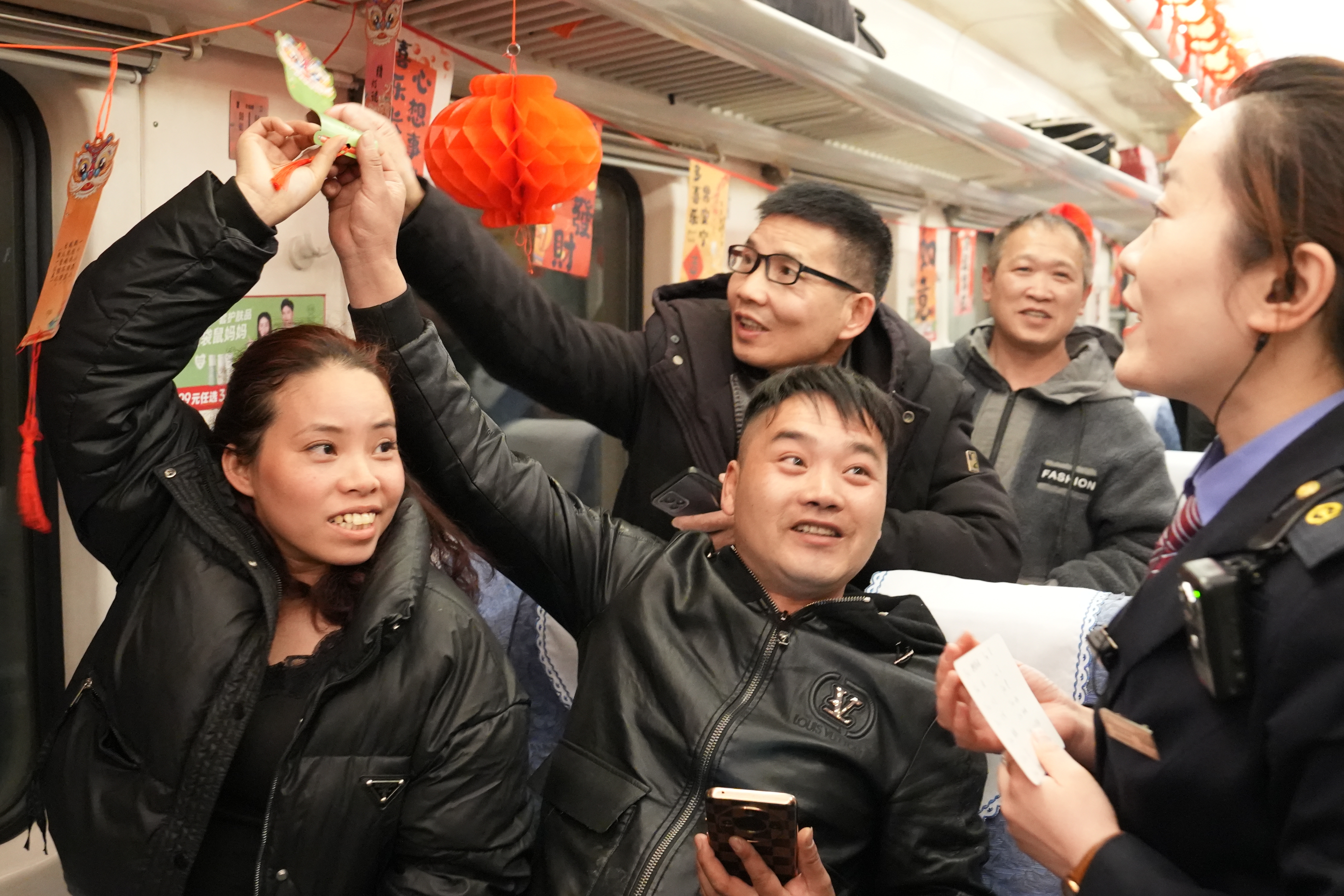 一踏入车厢,浓浓的节日气息便扑面而来。红色灯笼在行李架上摇曳生姿,剪纸窗花在玻璃窗上绽放春意,彩带如流星般穿梭在车厢之间,处处洋溢着喜庆与祥和。