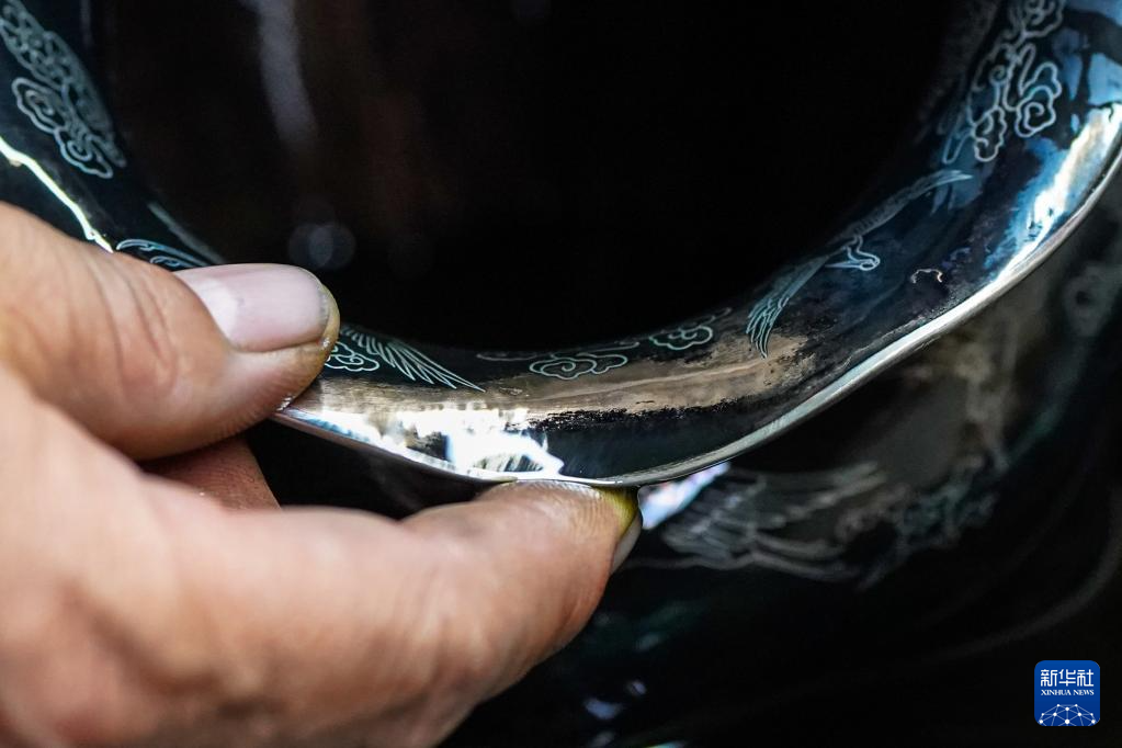 10月25日,在昆明乌铜走银传习馆,金永才在擦拭保养乌铜走银作品。