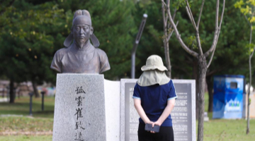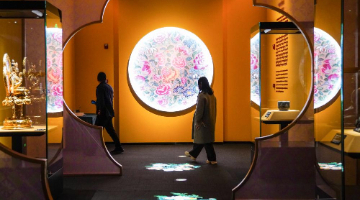 11月2日,绣娘代表在湖北省宜昌市秭归县屈原故里景区芈绣馆前展示她们的作品。