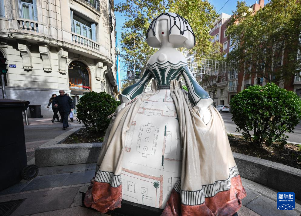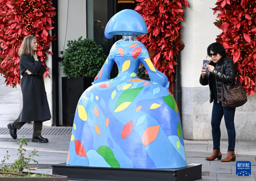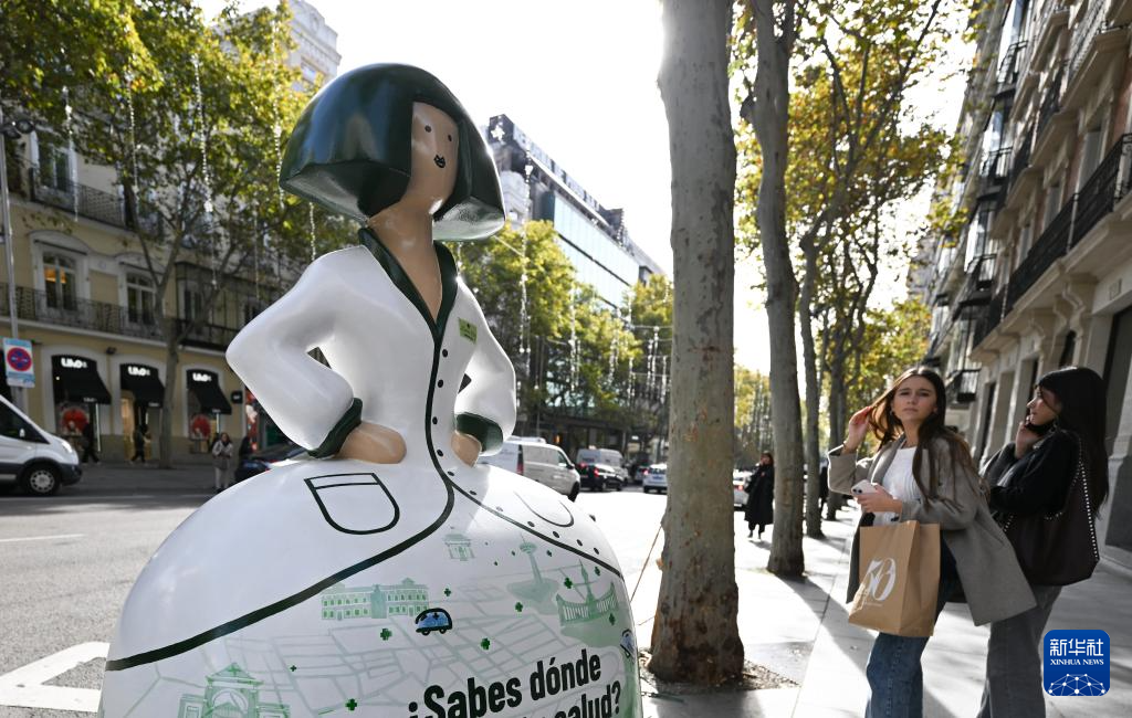 这是11月19日在西班牙马德里街头拍摄的“宫娥”主题雕塑。