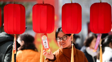 2月10日,游客在2026圆明园新春灯会入口处拍照。