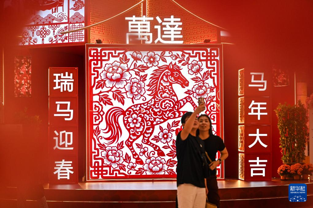 1月30日,在马来西亚吉隆坡,人们在一家商场的马年剪纸主题装饰前拍照留念。