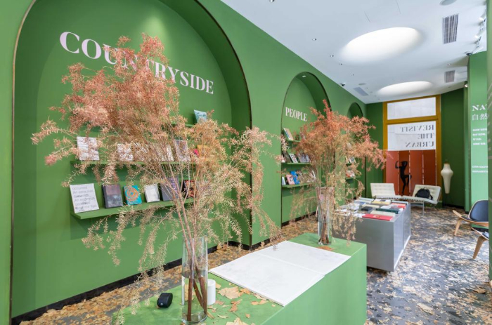 11月19日,在上海市徐汇区西岸艺术中心附近一家书店内,落叶被布置在各个角落。