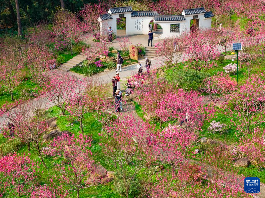 3月4日,游客在广西南宁市青秀山风景区桃花坞踏青赏花(无人机照片)。