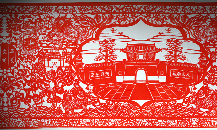 于是我決定回家專門剪紙,但是我父母認(rèn)為鉸花都是老婆婆們閑著沒事做的事,你一個(gè)男孩子還是應(yīng)該好好賺錢。就這樣我跟父母僵持了很久,但最后還是我拗著性子從外邊回到了我們農(nóng)村老家,開始尋找會(huì)剪紙的老人,去記錄、去詢問、學(xué)習(xí)我們地區(qū)傳統(tǒng)的剪紙民俗知識。因?yàn)楝F(xiàn)在像剪紙這個(gè)藝術(shù),在我們的地區(qū)還僅是一些老人出自一些喜好去剪、去做,但隨著這些老人的去世,這些作品也就會(huì)隨著一把火被燒掉。我希望我能把這些東西都保留下來,我希望有更多的人去了解我們地區(qū)的剪紙文化,所以我就下決心收集這些剪紙的資料,去申報(bào)非物質(zhì)文化遺產(chǎn)名錄。想要申報(bào)還要去做很多的事情,一是去尋找這些傳世的老作品,另外就是要擴(kuò)大孟津剪紙的影響力,參加各種比賽去獲獎(jiǎng)。那時(shí)我白天去尋找老藝人,晚上就自己在屋里埋頭創(chuàng)作,每天晚上都會(huì)剪到凌晨一點(diǎn)多。我媽本來是反對的,但是當(dāng)她看到每晚我都會(huì)剪到很晚,她就明白了我是真心喜歡這個(gè)事兒,就慢慢地開始心疼我。后來她也幫助我開始粘貼,像我剪的《都說我孟津好風(fēng)光》,這個(gè)作品長13米,沒有那么長的紙,我們就一起粘貼。花了三個(gè)多月剪完,家里邊沒有那么大粘貼裝裱的空間,我父母就站在我們家院子的平房頂上一起把它鋪開,一個(gè)一個(gè)地粘起來裱好。